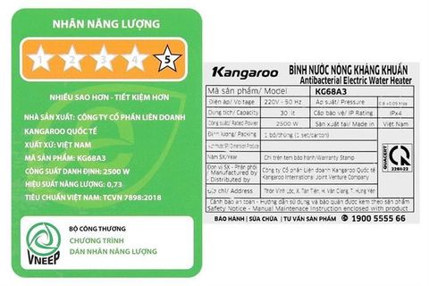 - Thuộc dòng máy nước nóng gián tiếp, Kangaroo 30 lít 2500W KG68A3 có dung tích 30 lít phù hợp với gia đình từ 3 - 5 thành viên.